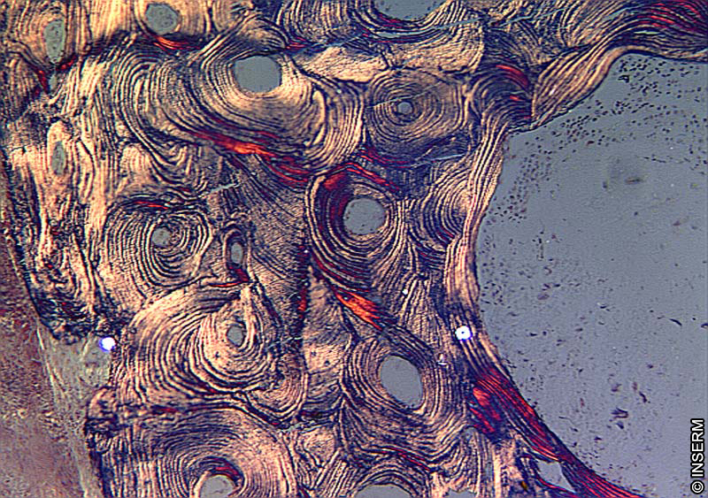 Jean-Paul Roux, INSERM U831:Image d’une coupe histologique d’une corticale (enveloppe osseuse). La structure lamellaire de l’os est ici mise en évidence par polarisation, celle-ci est enroulée autour d’un canal central appelé canal de Havers.