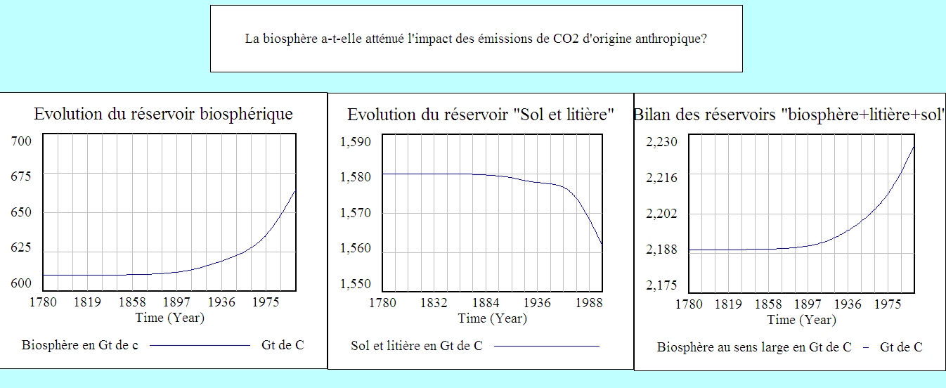- Page 1 : Le modèle comporte 3 compartiments (atmosphère, biosphère et sols) et des flux (photosynthèse, respiration de la biosphère, chute de la litière et respiration du sol). Le modèle prend en compte les apports anthropiques historiques. Un variable bilan a été créée : elle fait la somme des 2 réservoirs "biosphère et sols".
