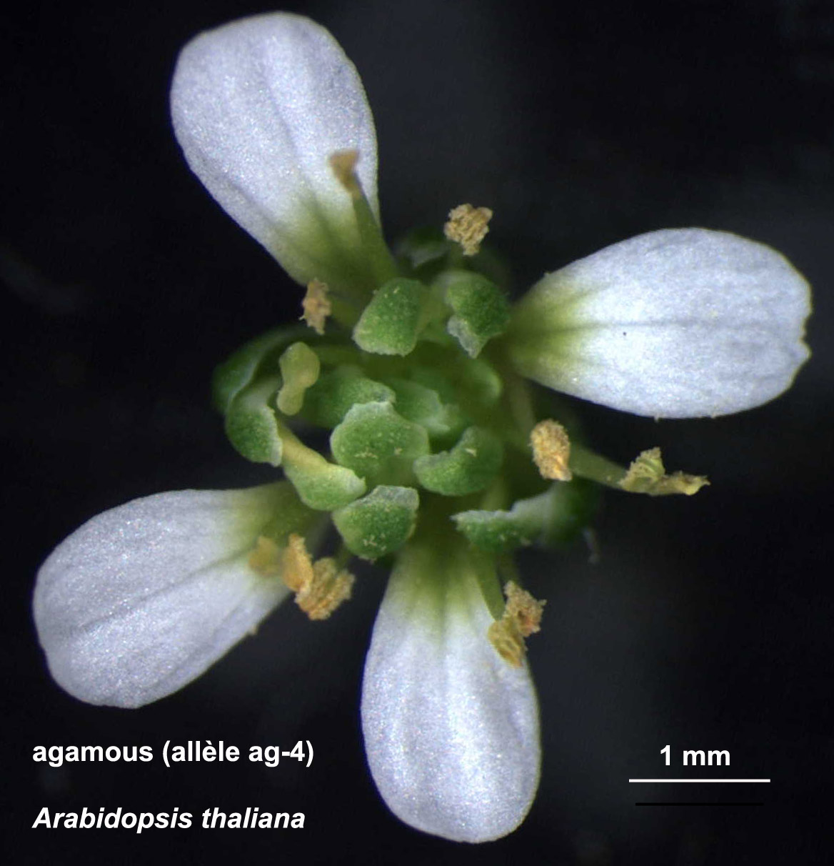 Fleur entière du mutant agamous-4 d'A.thaliana ; vue de dessus et observée à la loupe binoculaire ; barre d'échelle : 1 mm ; image obtenue par Christophe TREHIN (Laboratoire RDP, UMR 5667)