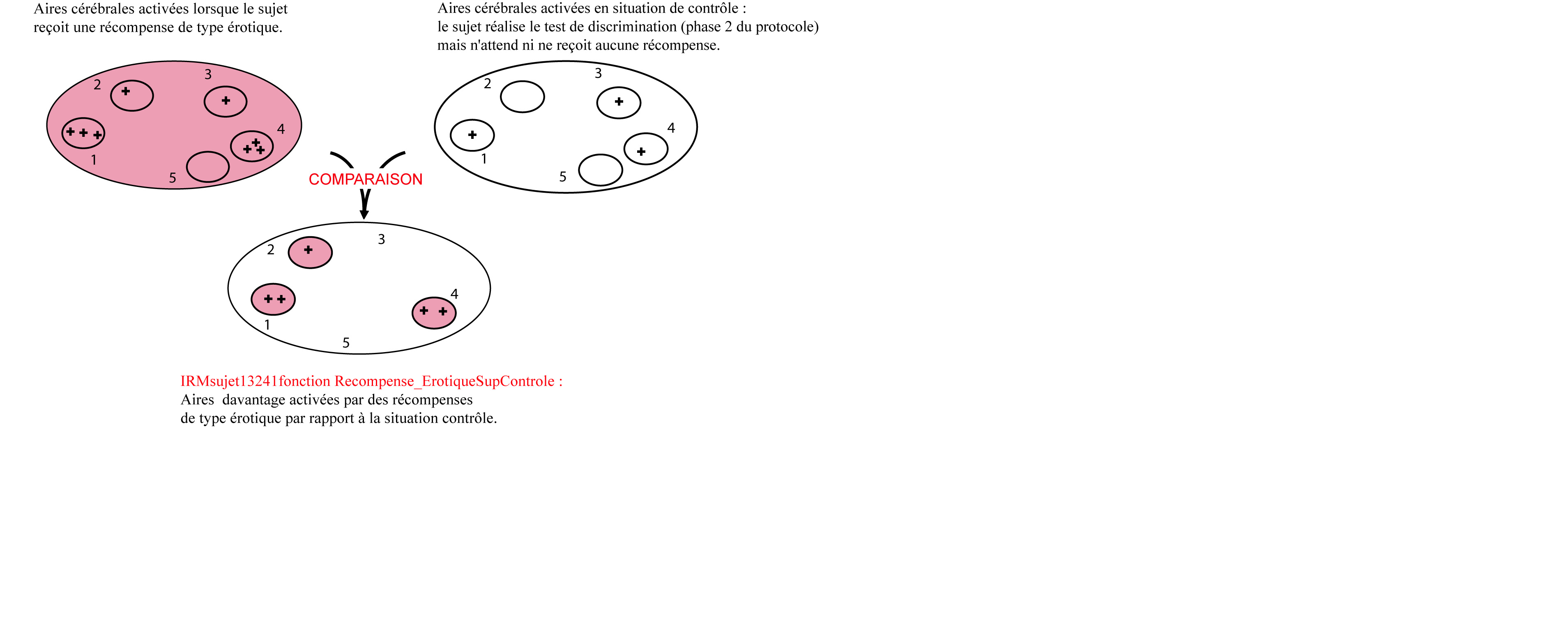schéma illustrant la notion d'image construite par traitement statistique de deux enregistrements dans deux conditions expérimentales différentes : contrôle vs réception d'une récompense de type érotique