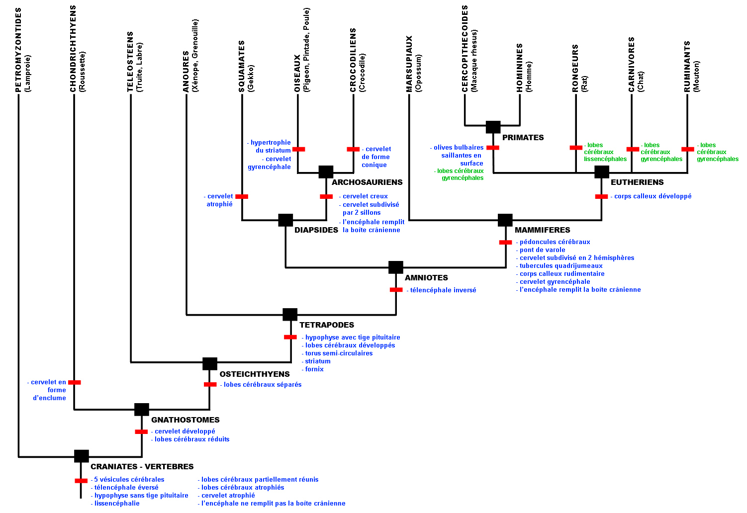 Arbre phylogénétique des vertébrés établi à partir de caractères morpho-anatomiques de l'encéphale signalés par les ouvrages d'anatomie comparée référencés dans la bibliographie du dossier.
