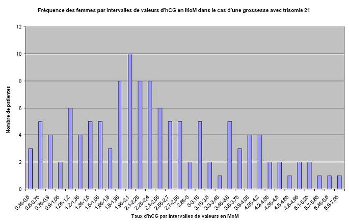 histogramme de fréquence d'intervalles d'hCG en cas de grossesse d'enfant trisomique en MoM