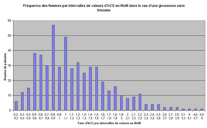 histogramme de fréquence d'intervalles d'hCG dans le cas d'une population normale en MoM